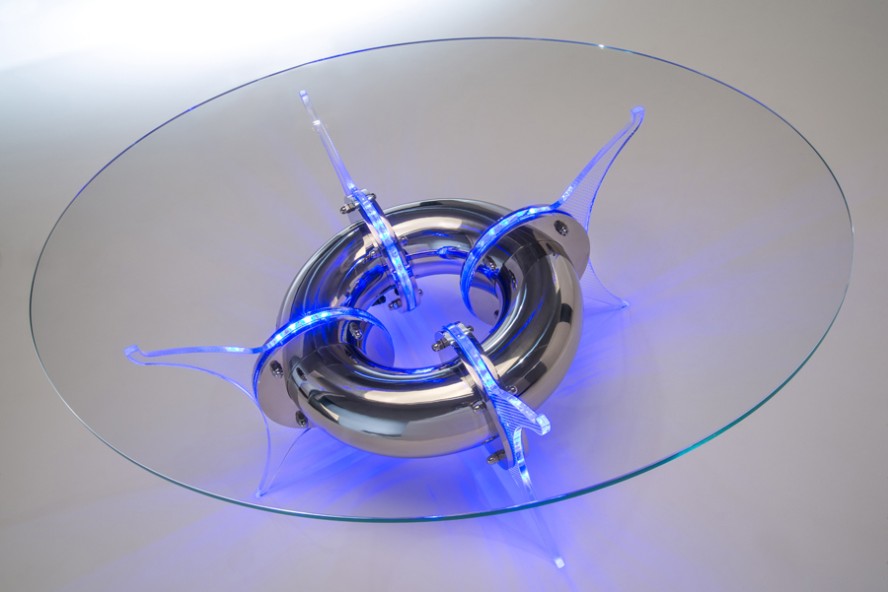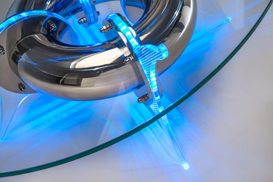 Le gambe del tavolino in acciaio inox possono essere sostituite con sostegni in vetro temprato resistente ,oppure plexiglass al cui interno si sistemano dei led capaci di riprodurre luci del colore che più si desidera creando un atmosfera magica.